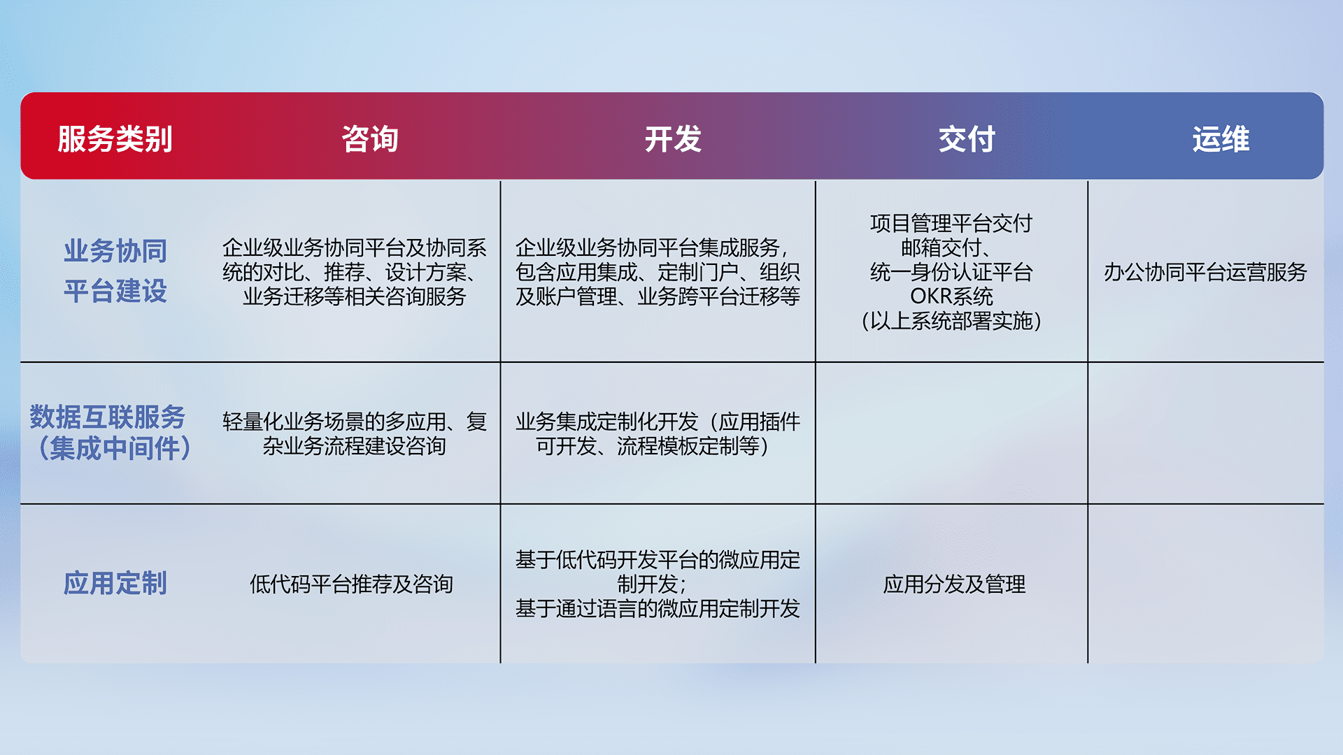 针对钉钉、、、、企微、、、、IDaas等平台级产品提供产品的规划、、、、方案、、、交付、、、、定制化开发等服务,,实现如统一协同办公、、、智能客户服务、、、混合会议管理、、智能数据查询、、等业务场景,,实现数字化转型。。。